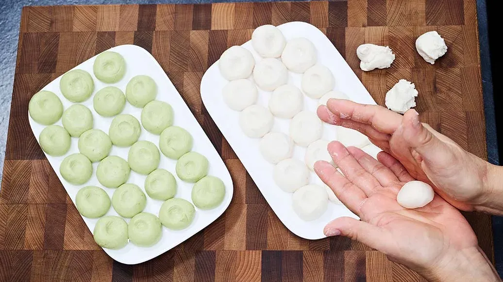 Dumplings de mochi com matcha e molho de manga