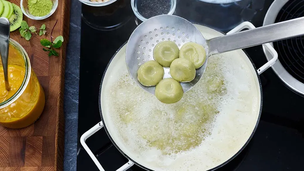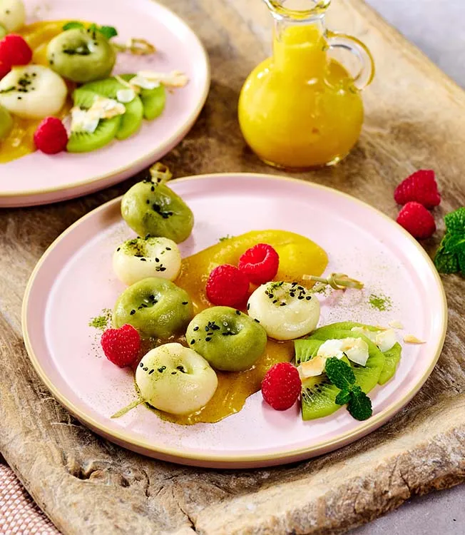 Quando os dumplings estiverem cozidos, retire-os, deixe-os arrefecer rapidamente em água fria ou gelada e escorra bem. Sirva-os em pratos com o molho de manga e decore com o kiwi, a hortelã, um pouco de pó de matcha, sementes de sésamo pretas, flocos de coco e framboesas.