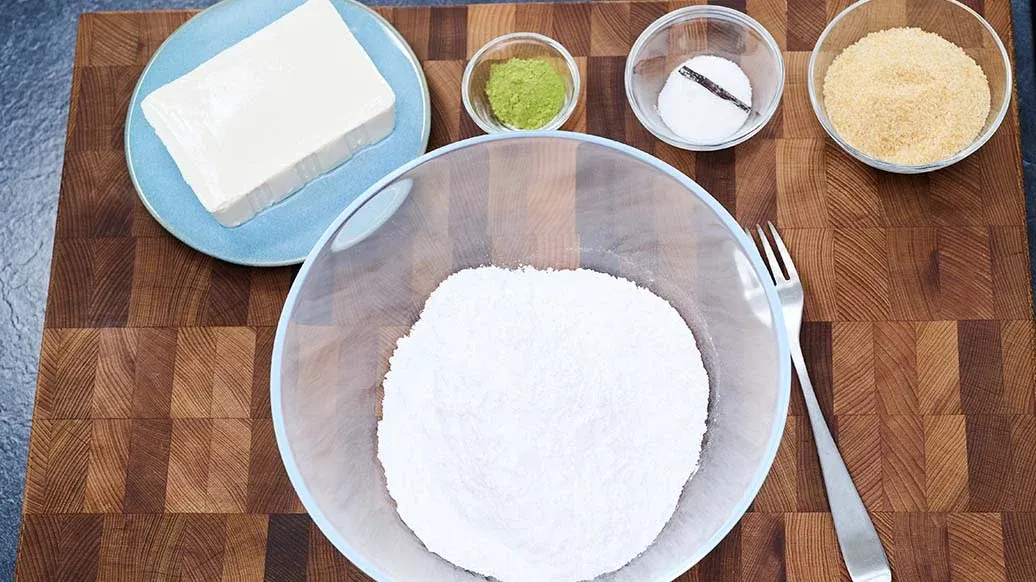 200 g de tofu sedoso – 200 g de farinha de arroz – 3 colheres de sopa de açúcar mascavado – 2 colheres de chá de açúcar baunilhado com baunilha bourbon – 1 colheres de chá de matcha em pó