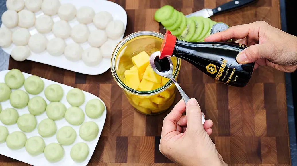 Triture a manga com o Molho de Soja Kikkoman e o Tempero Doce Kikkoman ao Estilo Mirin. Descasque os kiwis e corte-os em fatias ou cubos.