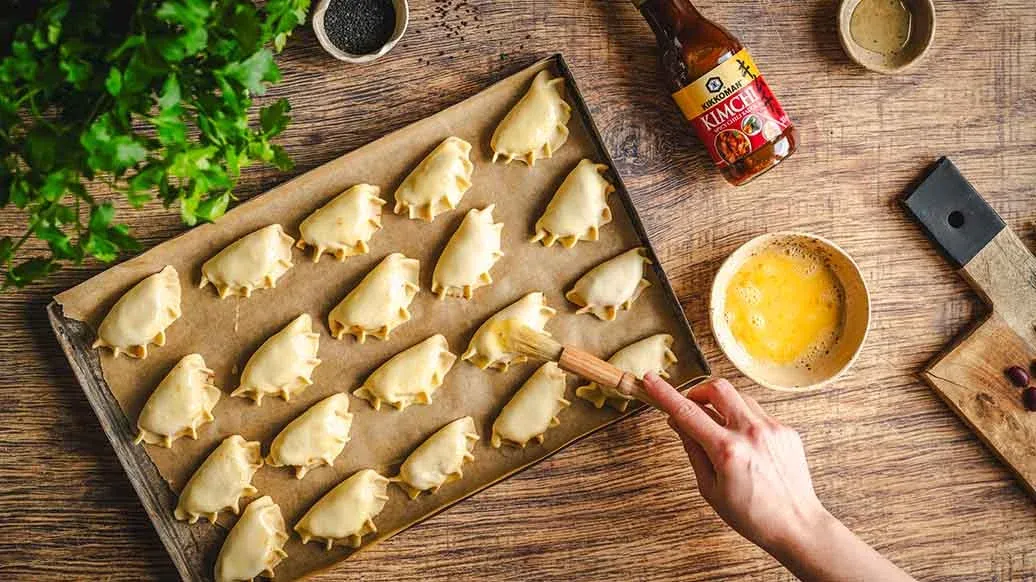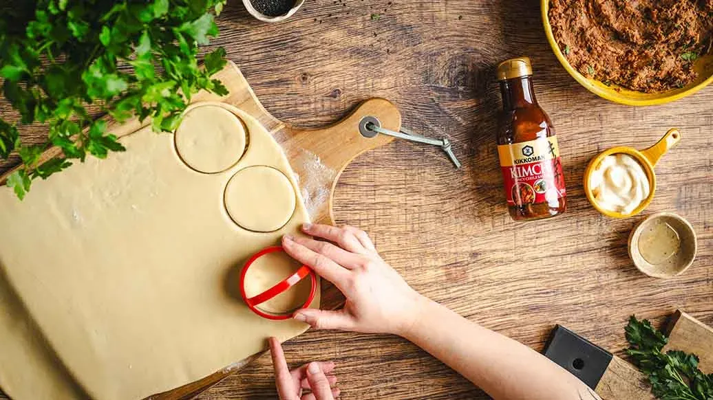 Pode substituir o Molho Kikkoman Kimchi Chili no recheio por 1 colher de sopa de sriracha misturada com 1 colher de sopa de Molho de Soja Kikkoman. A massa também pode ser substituída por massa folhada pré-preparada.