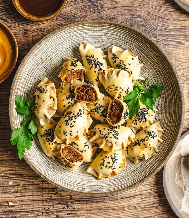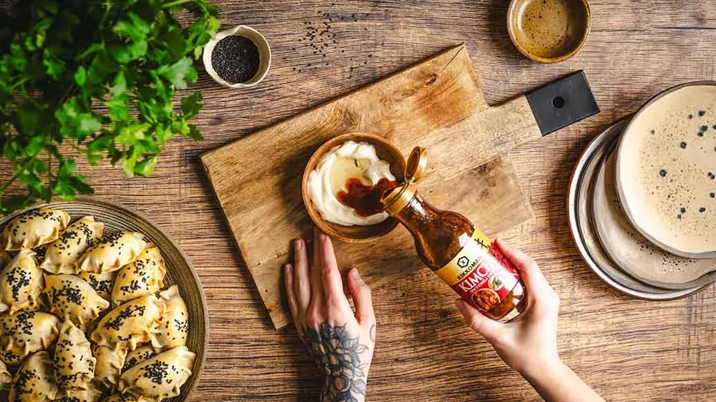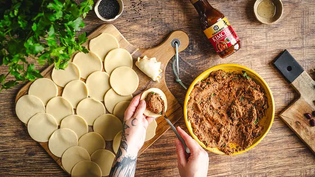 Empanadas crocantes assadas no forno, recheadas com uma mistura saborosa de atum, feijão e tomates secos ao sol. O Kikkoman Kimchi Chili — usado tanto no recheio como no molho — adiciona um toque suave de picante e mais profundidade de sabor.