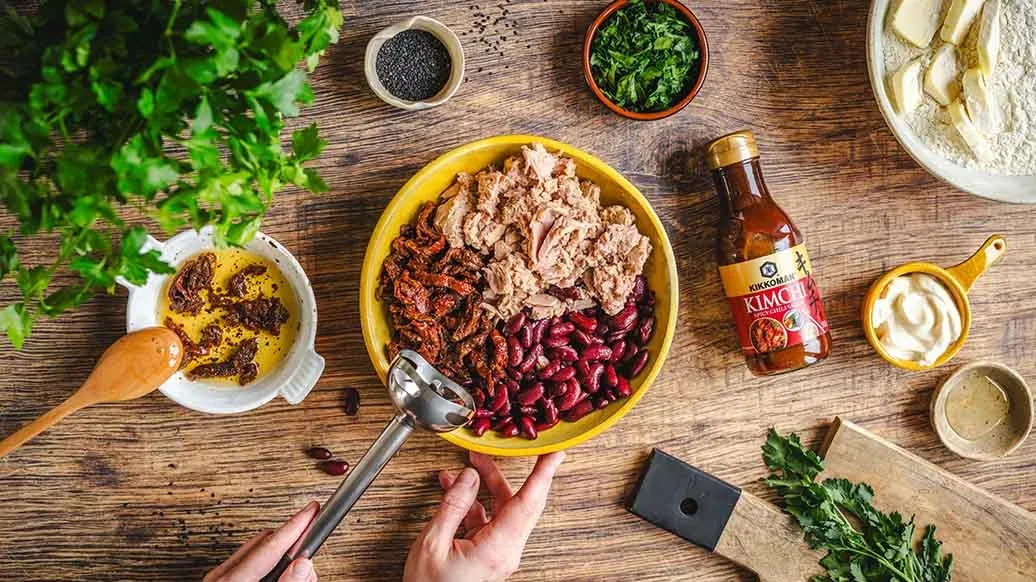 Escorra o atum e misture-o com o feijão e os tomates secos ao sol até obter uma pasta ligeiramente granulosa. Adicione a salsa e o Molho Kikkoman Kimchi Chili.