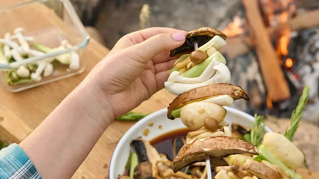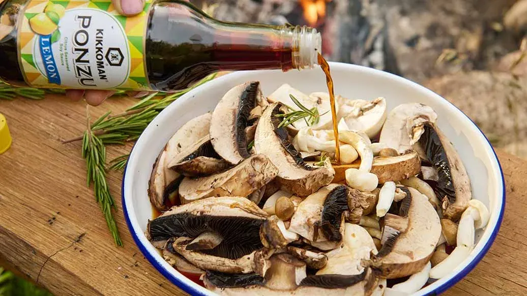 Estas espetadas de cogumelos e alho francês aromatizadas com alecrim, alho e Kikkoman Ponzu de limão são um prato simples, mas delicioso - ideal para churrascos ou refeições rápidas.