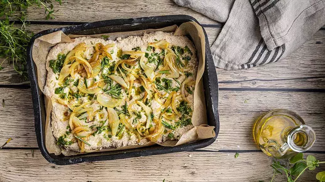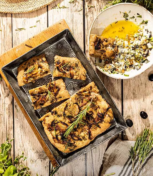 Saboreie uma focaccia fofa, sem glúten, infundida com alecrim e cebolas - uma homenagem às suas raízes etruscas. Combinada com azeite de ervas, queijo feta e nozes, é ideal para um piquenique.