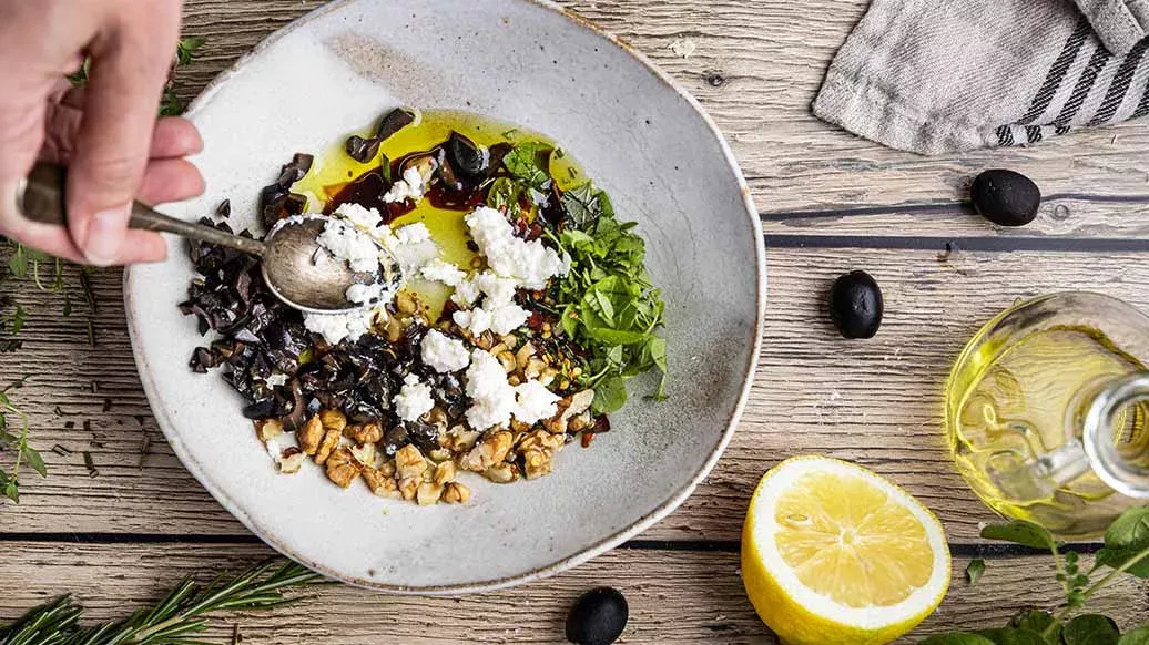 40 ml de azeite de boa qualidade – 1 colheres de chá Kikkoman Molho de Soja Tamari Fermentado Naturalmente Isento de Glúten – 1 ramo de alecrim – ½ colheres de chá de tomilho picado – ½ colheres de chá de orégãos picados – ½ limão – 30 g de azeitonas – 30 g de queijo feta – 20 g de nozes – 1 colheres de chá de malagueta em flocos