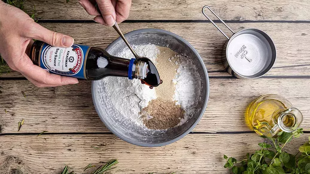 100 g de farinha de trigo sarraceno branca – 50 g de farinha de arroz – 70 g de fécula de batata – 1 colheres de sopa de cascas de psílio – 250 ml de água – 5 g de levedura seca – 1 colheres de chá Kikkoman Molho de Soja Tamari Fermentado Naturalmente Isento de Glúten