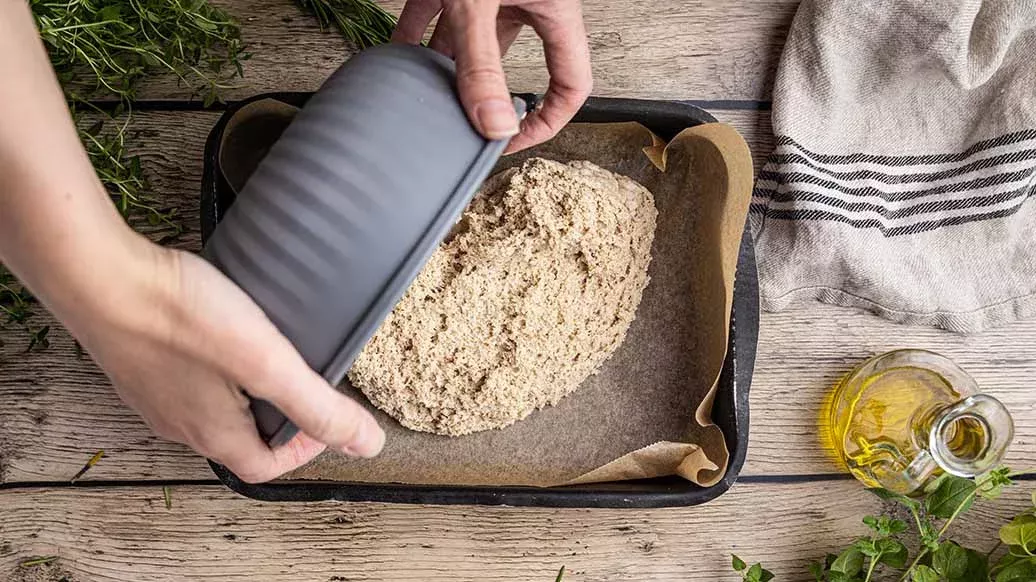 Misture as farinhas, a fécula de batata, as cascas de psílio, a água, o fermento e o molho de soja sem glúten Kikkoman durante cerca de 5 minutos. Durante este tempo, a massa vai engrossar até atingir a consistência certa. Se ficar demasiado espessa, pode adicionar mais água; se ainda estiver demasiado líquida após 5 minutos, adicione mais farinha de trigo sarraceno. Cubra a massa com um pano e deixe-a levedar num local quente durante cerca de uma hora.