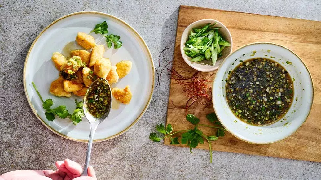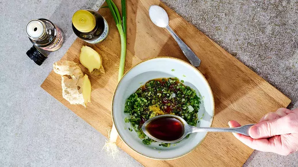 1 cebolinha – 6 colheres de sopa Kikkoman Molho de Soja Ponzu Yuzu – 2 colheres de chá Kikkoman Óleo de Sésamo Tostado – 1 colheres de chá de açúcar – ½ colheres de chá de gengibre ralado