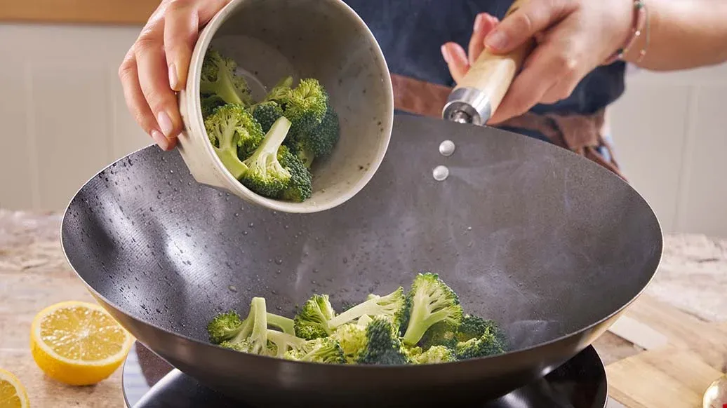 Adicione o óleo à mesma wok, refogue o alho e os brócolos por 1-2 minutos. Adicione a água e deixe evaporar em lume médio até os brócolos amolecerem. Adicione o pimento e cozinhe por mais 2-3 minutos.