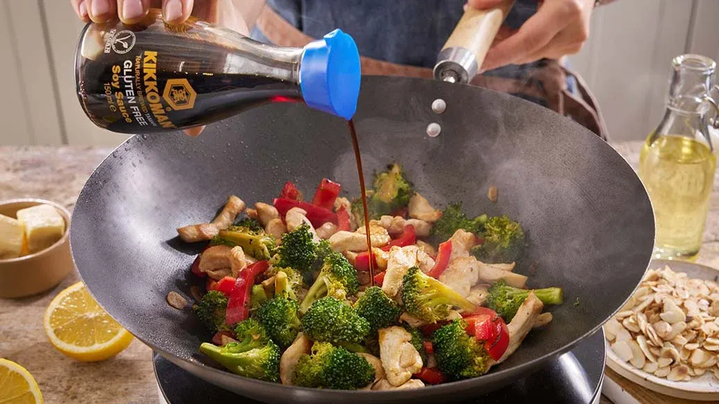 Coloque o frango de volta no wok, adicione o Molho de Soja Kikkoman sem Glúten e o sumo de limão. Mexa bem e aqueça por 1-2 minutos. Retire do lume, adicione a manteiga fria e mexa até derreter e o molho emulsionar. Cubra com as amêndoas torradas em flocos.