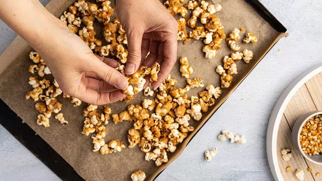 Espalhe as pipocas de caramelo num tabuleiro grande forrado com papel vegetal. Espere que endureçam, depois desfaça-as em pedaços e volte a colocá-las na tigela.