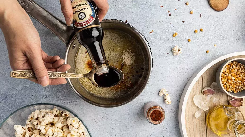 Derreta a manteiga num tacho e, em seguida, adicione o molho de soja Kikkoman e as especiarias (alho, pimentão e malagueta). Verta a mistura sobre uma das tigelas de pipocas, adicione o queijo parmesão e misture bem para que as pipocas fiquem cobertas com as especiarias.