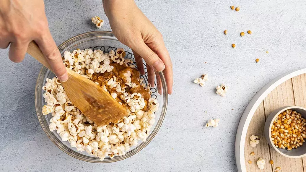 Para preparar o caramelo, deite o açúcar e a água num tacho. Aqueça-os até se dissolverem sem mexer. Agite suavemente o tacho para distribuir o açúcar uniformemente. Quando ficar dourado, adicione a manteiga e o molho de soja Kikkoman. Mexa e verta sobre a outra taça de pipocas.