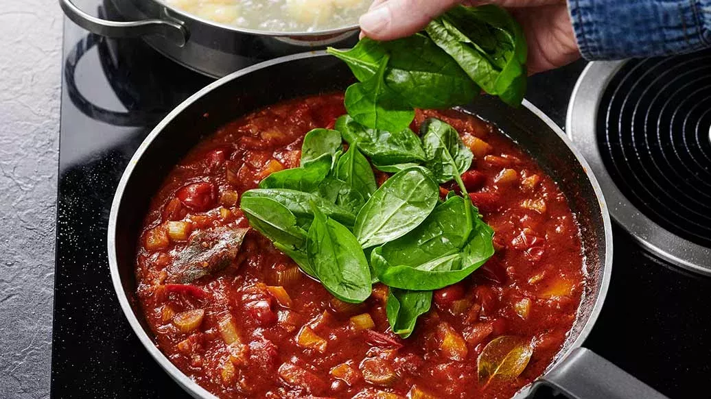 Gnocchi picantes de tomate e salsichas com funcho e espinafre