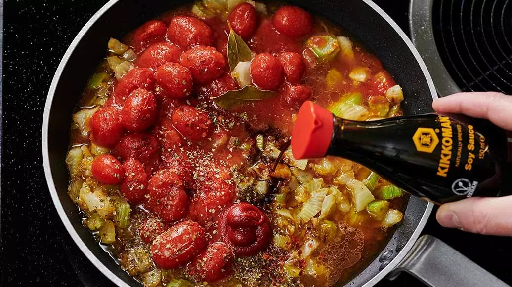 Esta é a comida perfeita de conforto. Carne de salsicha saborosa reforçada com o sabor do molho de soja, misturada com um molho de tomate picante e gnocchi fresco.