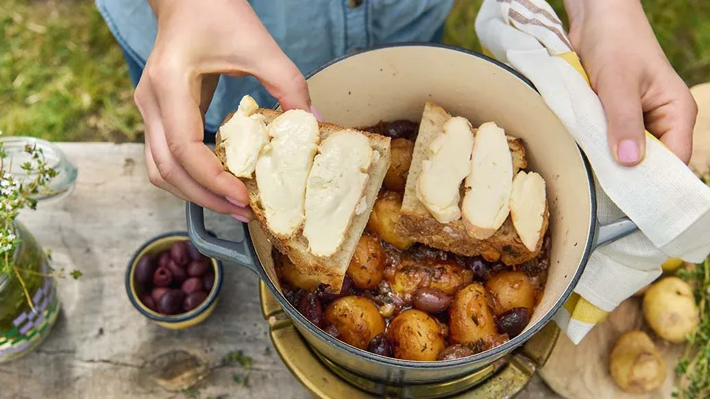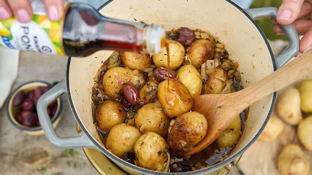 300 g de batatas pequenas – 2 colheres de sopa de óleo – 1 cebola, bem picada – 2 dentes de alho picados – 70 g de azeitonas kalamata, sem caroço e cortadas ao meio – 350 ml de caldo de legumes – 3 ramos de tomilho fresco – 1 colheres de chá de orégãos secos – 4 colheres de sopa Kikkoman Molho de Soja Ponzu Limão – 4 colheres de sopa Kikkoman Marinada Teriyaki