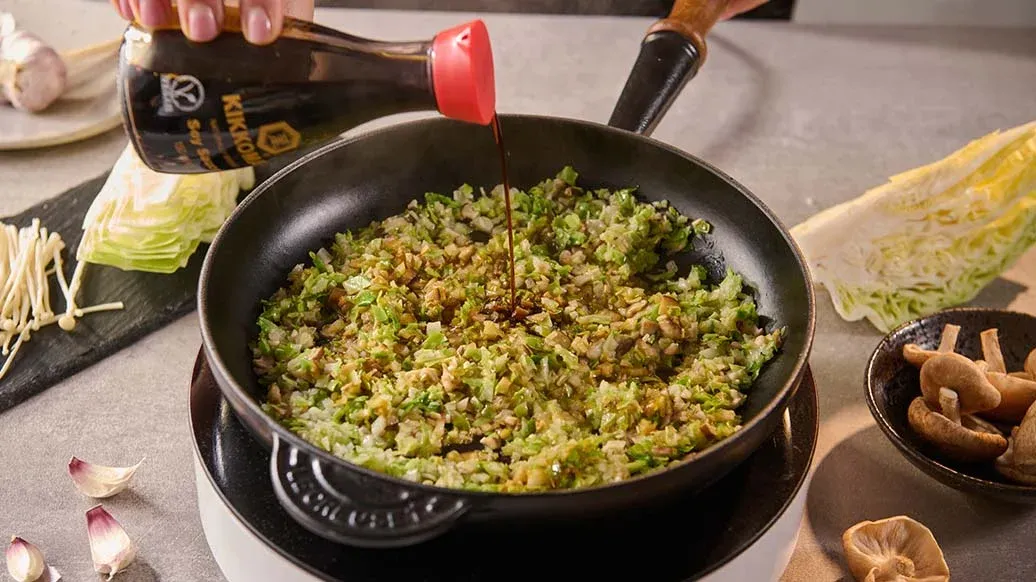 Pique muito bem os legumes para o recheio e frite em óleo durante cerca de 10 minutos até os ingredientes ficarem macios. Tempere com o molho de soja Kikkoman.