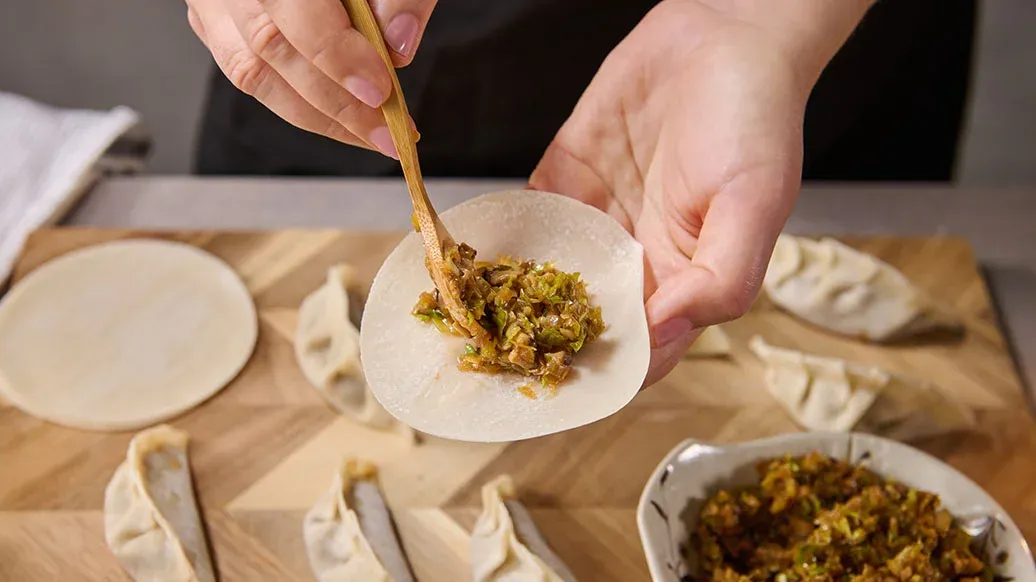 Encha as folhas de massa com o recheio do passo 1 e enrole-as para formar gyozas.