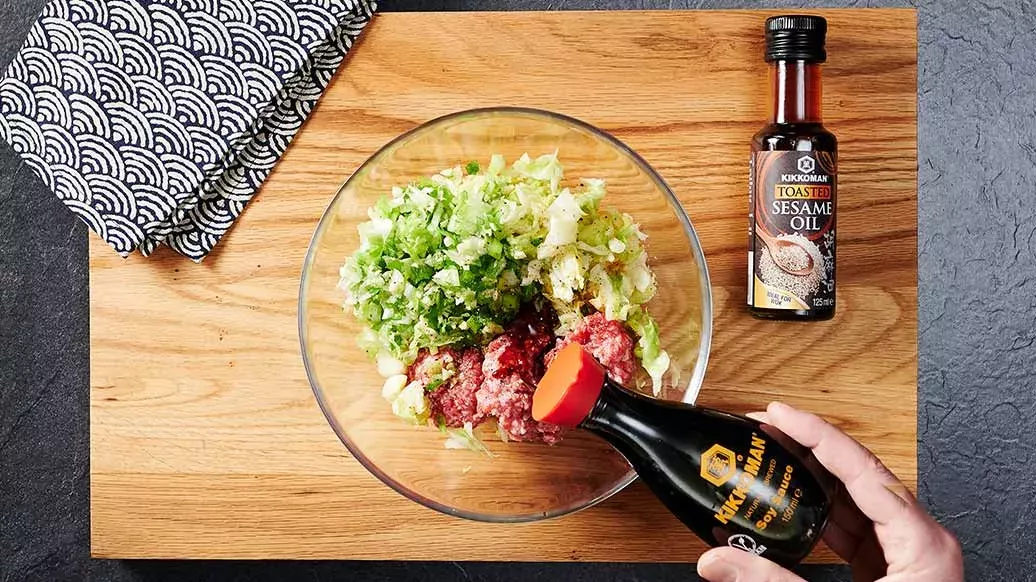 Misturar os alhos-franceses, o alho, o gengibre, a couve tipo coração, a carne picada, o açúcar, o sal, a pimenta, o molho de soja e o óleo de sésamo.