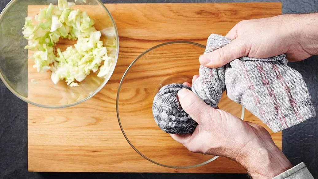 Limpar a couve tipo coração, lavar e picar grosseiramente, polvilhar com 1 colher de chá de sal e espremer bem com as mãos. Colocar a couve tipo coração picada num pano e apertar bem para que o líquido da couve possa escorrer bem.