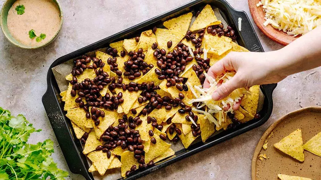 Nachos estaladiços, misturados com queijo cheddar derretido e feijões aromáticos, com um molho picante e cremoso de maionese para tacos. Este é o prato perfeito para festas e encontros com amigos.