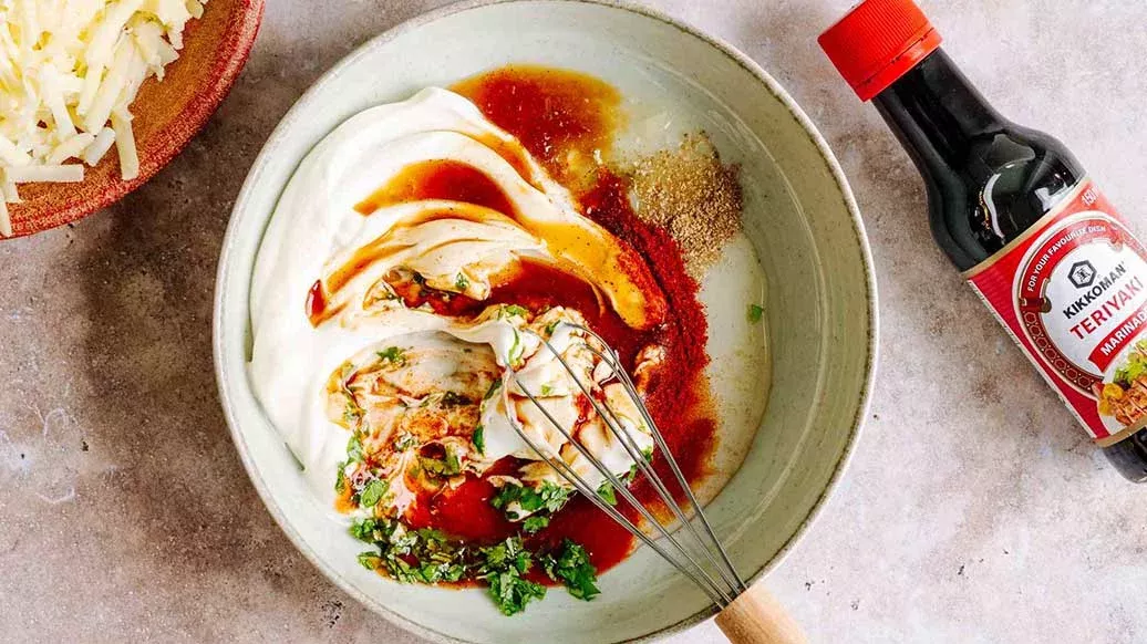 3 colheres de sopa de maionese – 1 colheres de sopa Kikkoman Marinada Teriyaki – 1 colheres de chá de molho sriracha – 2 colheres de sopa de sumo de lima – 1 colheres de sopa de xarope de agave – 1 colheres de chá de paprica fumada – ½ colheres de chá de cominhos moídos – ½ colheres de chá de coentros moídos – 1 colheres de sopa de coentros picados