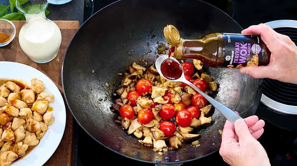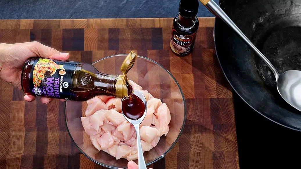 Corte o peito de frango em cubos ou tiras e deixe marinar com o Molho Kikkoman Teriyaki Wok com Alho Assado durante cerca de 5 minutos. Aqueça o Óleo de Sésamo da Kikkoman num wok, frite o peito de frango por cerca de 8 minutos e retire.