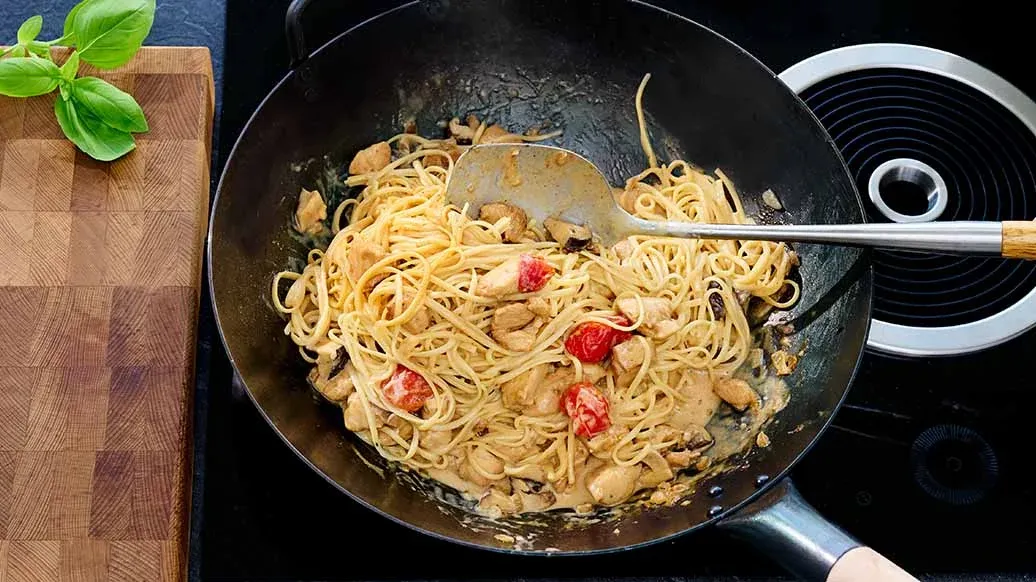 Adicione as natas e o restante Molho Kikkoman Teriyaki Wok com Alho Tostado e deixe ferver. Rale o queijo Pecorino, misture-o ao molho e tempere com a pimenta preta e pimenta caiena. Cozinhe a massa de acordo com as instruções da embalagem.