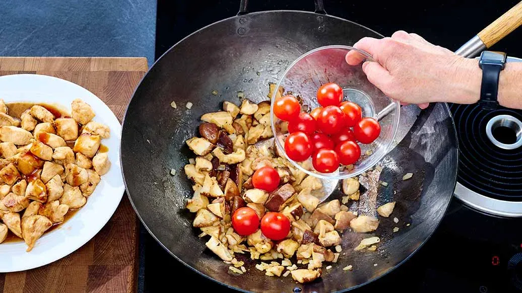 Para o molho, aqueça a manteiga no wok. Corte os cogumelos em pedaços de aproximadamente 2 cm. Pique a cebola, pique bem o alho e refogue ambos com os cogumelos na manteiga aquecida durante cerca de 5 minutos. Adicione os tomates e refogue por mais 3 minutos.