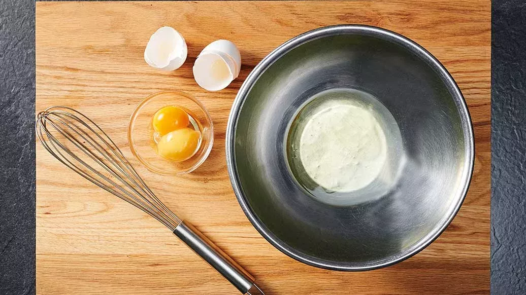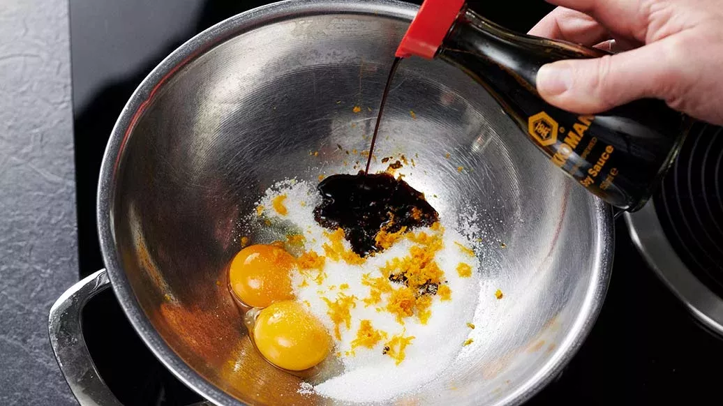 Depois, misture as gemas de ovo com o açúcar, baunilha raspada, raspa de laranja e molho de soja Kikkoman sobre o banho-maria até a mistura engrossar ligeiramente.