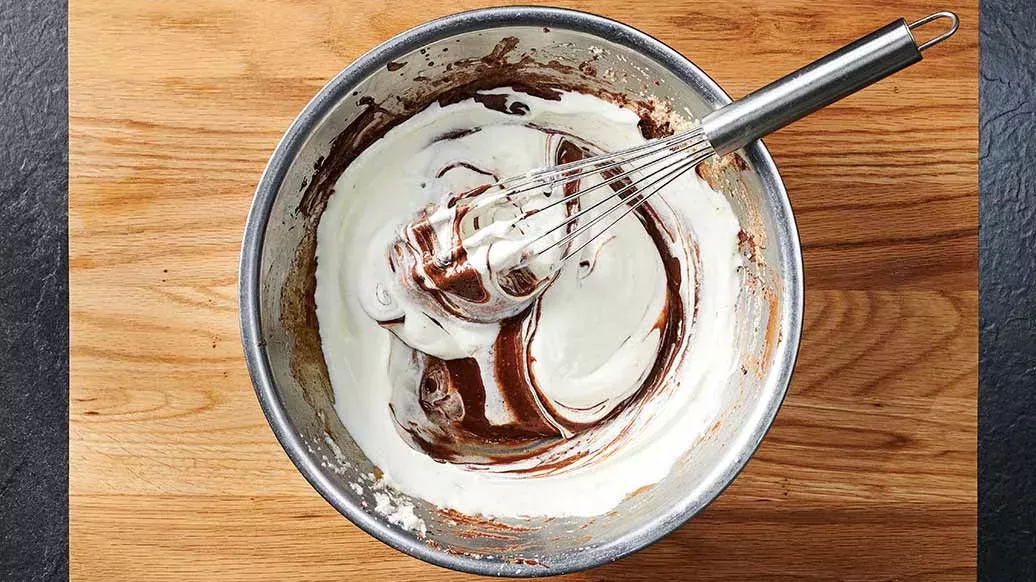 Remova a mistura do banho-maria e envolva rapidamente as claras em castelo, o chocolate e as natas na mistura das gemas, uma após outra.