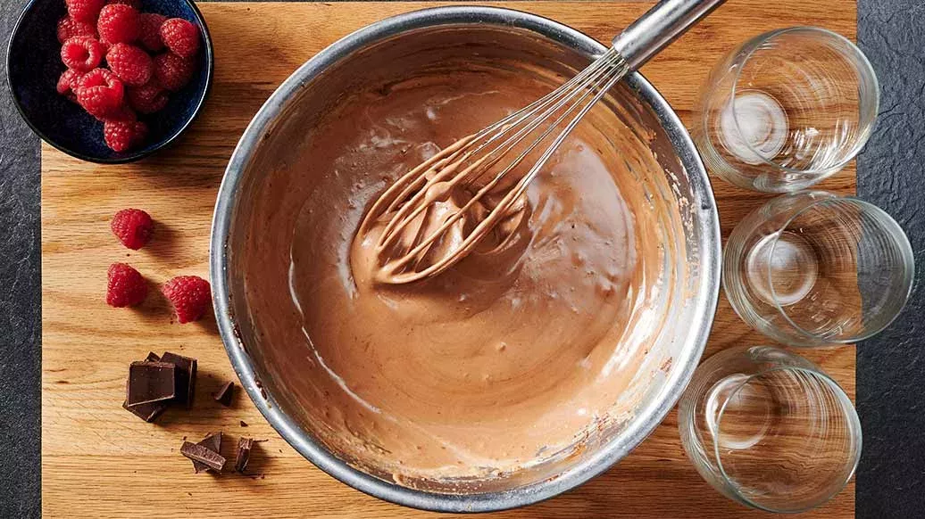 Antes de servir, coloque uma colher de natas batidas em cada mousse de chocolate e decore com framboesas e lascas de chocolate preto.