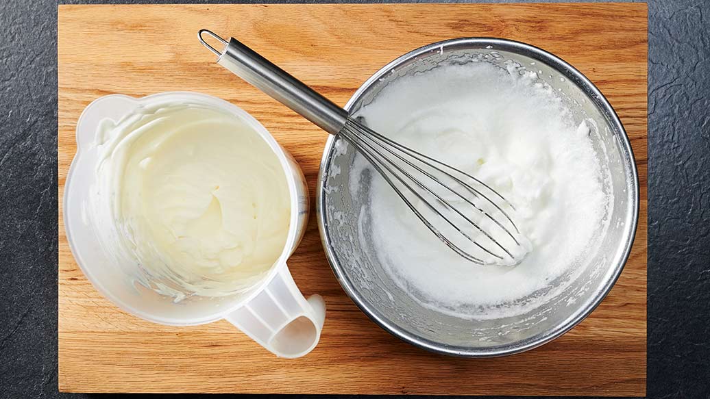 Entretanto, batas as natas numa taça até ficarem bem duras e, depois, as claras em castelo.