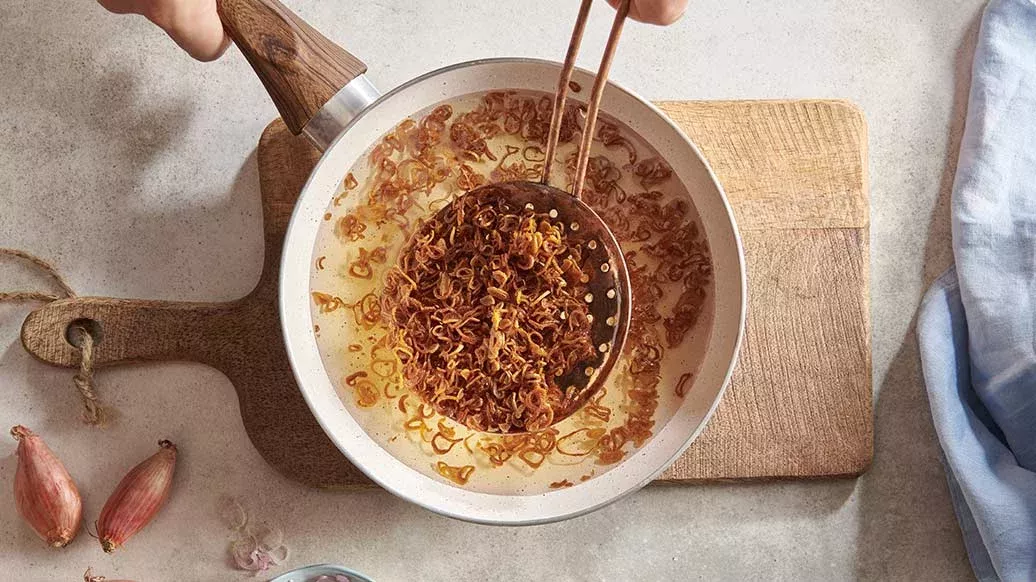 Corte as chalotas em fatias iguais e coloque-as sobre papel de cozinha. Polvilhe com duas pitadas de sal e deixe repousar durante 10-15 minutos para que o sal retire a humidade das chalotas. Pré-aqueça o óleo numa panela ou num wok para fritar. Colocar as chalotas no óleo e fritar até ficarem douradas. Em seguida, retire-as do óleo, escorra-as sobre papel de cozinha seco e polvilhe-as com sal.