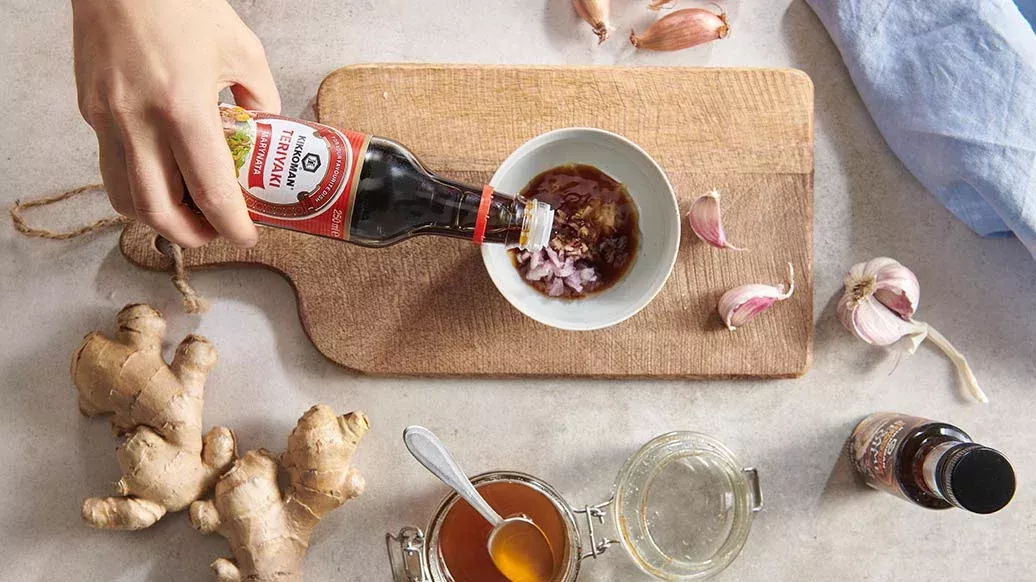 2 colheres de sopa Kikkoman Marinada Teriyaki – 1 colheres de sopa de vinagre de arroz – 1 colheres de sopa de mel – ¼ colheres de chá Kikkoman Óleo de Sésamo Tostado – ½ chalota – ½ colheres de chá de alho picado – 1 colheres de chá de gengibre em conserva (como para sushi)