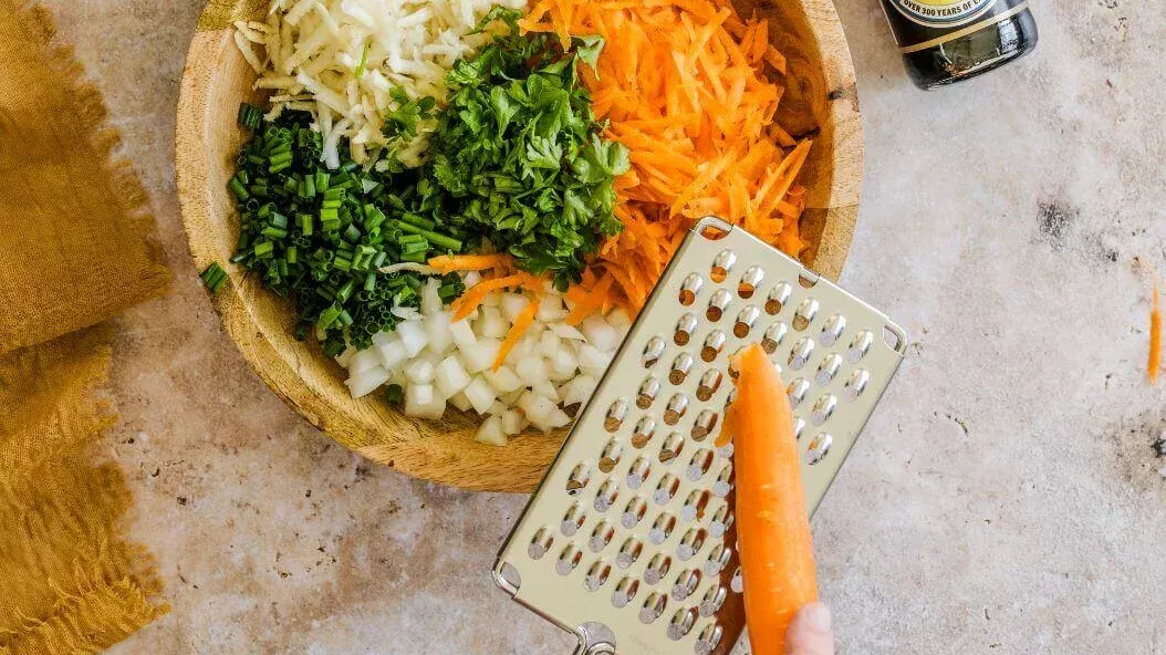 Ralar a cenoura e o aipo. Pique muito bem a cebola, o cebolinho, a salsa e a hortelã e misture-os com os legumes.