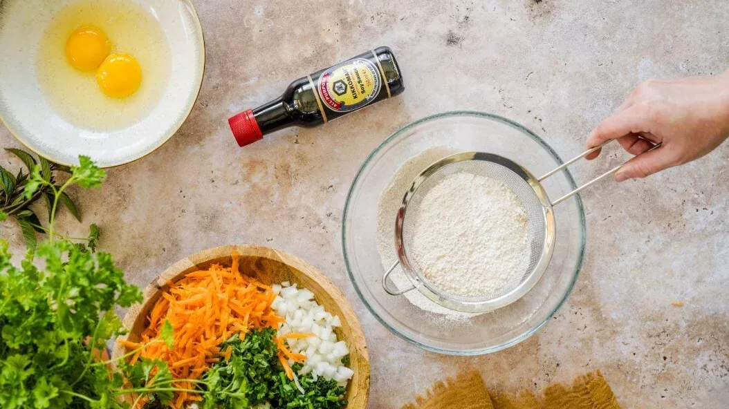 Peneire a farinha e misture-a com o fermento em pó. Bata os ovos com o leite e o molho de soja Kikkoman. Numa tigela, misture os ingredientes secos com os ingredientes húmidos para fazer uma massa e adicione os legumes com ervas. Tempere com pimenta e misture bem.