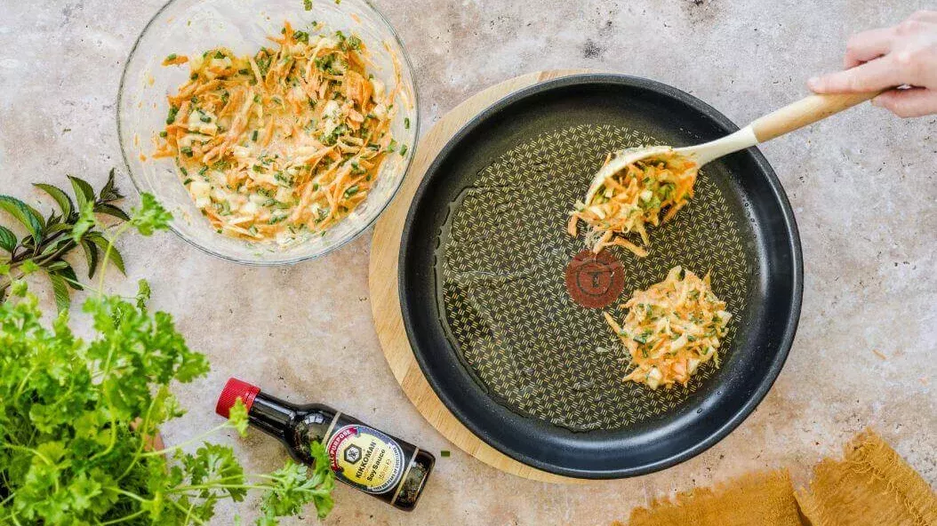 Aqueça uma pequena quantidade de óleo numa frigideira e reduza o lume. Coloque uma colher de massa para fazer pequenas panquecas e frite-as de ambos os lados. Sirva-as quentes com ervas aromáticas e Molho de Soja Kikkoman.