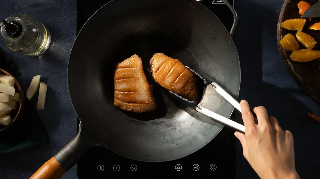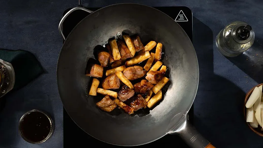 Frite o rabanete no wok quente durante 2 minutos. Corte o peito de pato ao meio no sentido do comprimento e corte cada metade em 6 pedaços, reservando o molho. Adicione o açúcar e os pedaços de pato ao wok e caramelize brevemente. Deglaceie com o molho do pato, o Molho Kikkoman Teriyaki com Alho e o sumo de laranja. Reduza rapidamente em lume alto para glacear o pato e o rabanete.