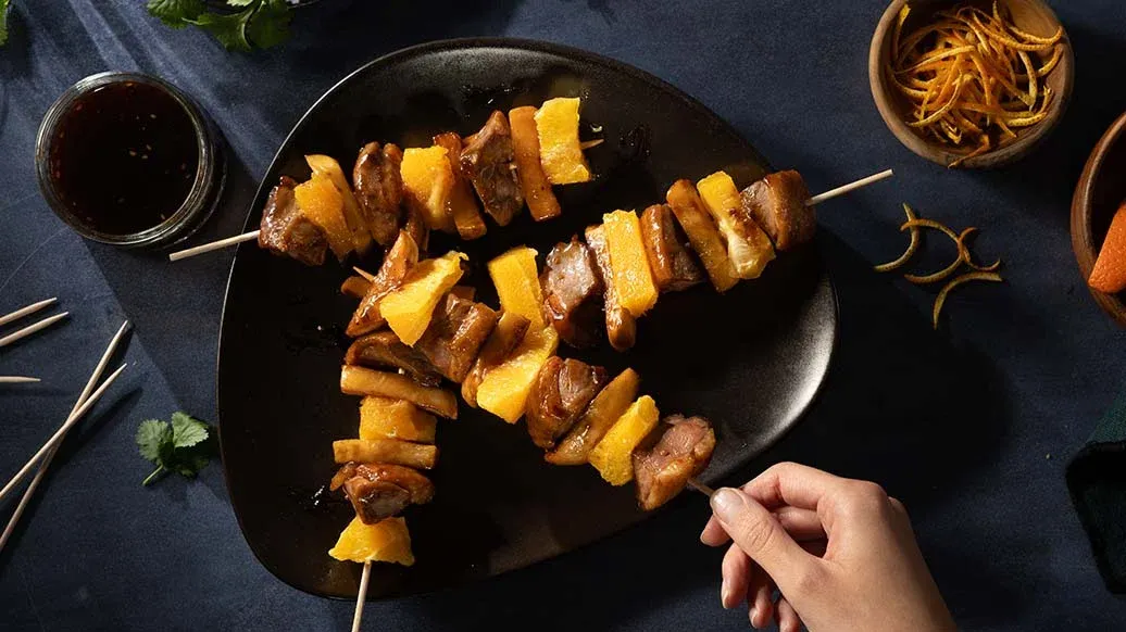 Petiscos crocantes e suculentos para festas ou como uma entrada asiático-francesa requintada. Peito de pato crocante e rabanete daikon são glaceados com Molho Kikkoman Teriyaki com Alho e combinados com laranja para criar espetadas elegantes.
