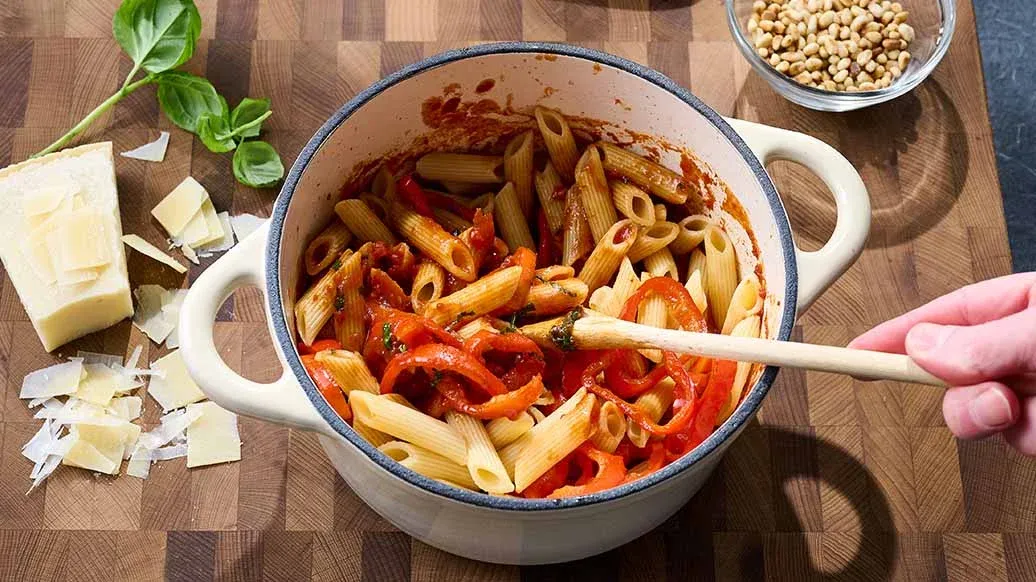 O clássico italiano encontra sabores asiáticos arrojados: este molho de tomate picante com Molho de Soja Kikkoman e Molho Kikkoman Kimchi Chili reveste a massa al dente, coberta com parmesão e pinhões tostados.