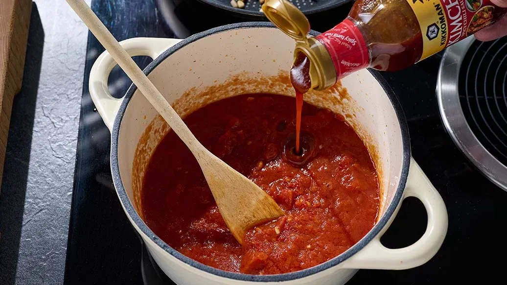 2 dentes de alho – 3 colheres de sopa de polpa de tomate – 1 colheres de sopa de azeite – 2 colheres de chá Kikkoman Molho de Chili Condimentado Kimchi – 600 g de tomates picados (enlatados) – 1 colheres de chá de açúcar mascavado (ou 1 colher de chá de Tempero Doce Kikkoman Mirin) – 40 g de pinhões