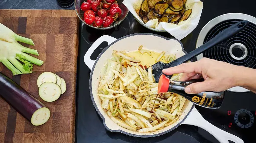 100 g de pimentos vermelhos pequenos e redondos (frescos ou em conserva) – 1 bolbo de funcho – 1 beringela japonesa – 2 colheres de sopa de azeite – 3 colheres de sopa Kikkoman Molho de Soja Fermentado Naturalmente – ¼ colheres de chá de pimenta
