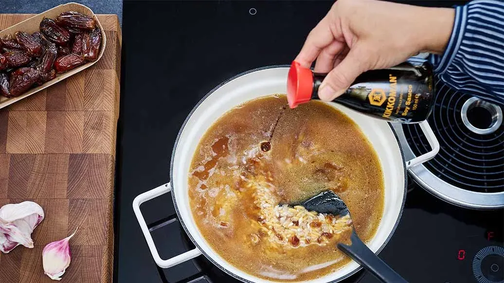 1 colheres de sopa de manteiga – 1 colheres de sopa de azeite – 100 g de massa orzo – 4 tâmaras – 1 dente de alho – 200 g de arroz de grão médio (por exemplo, Baldo ou Calrose) – 400 ml de caldo de borrego – 3 colheres de sopa Kikkoman Molho de Soja Fermentado Naturalmente