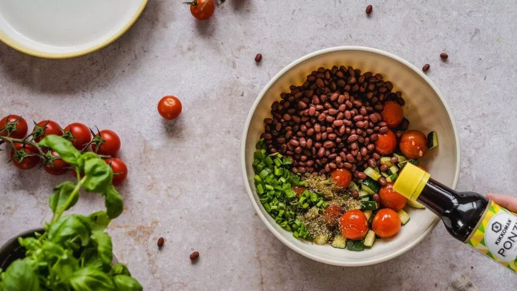 300 g de feijão adzuki cozido – 50 g de queijo cheddar – 1 colheres de sopa Kikkoman Molho de Soja Ponzu Limão – 2 colheres de sopa de cebolinho picado – 1 pitada de pimenta – 1 colheres de chá de orégãos secos – 1 colheres de chá de coentros em pó