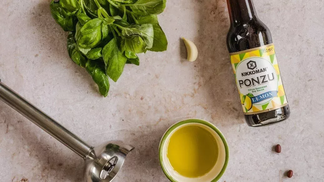 1 punhado de manjericão fresco – 3 colheres de sopa de azeite – 1 colheres de sopa Kikkoman Molho de Soja Ponzu Limão – 1 dente de alho, esmagado