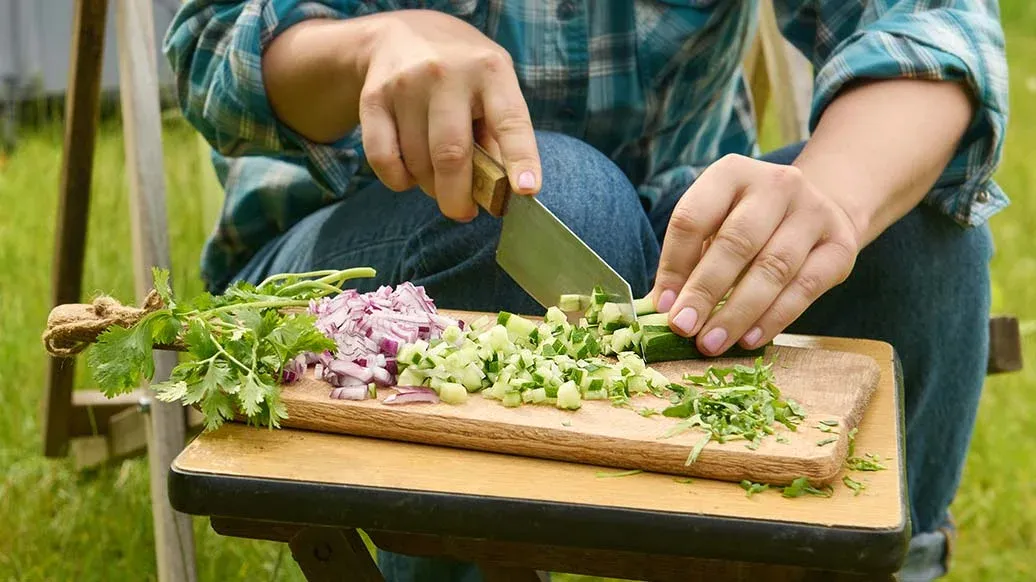 200 g de quinoa colorida – 1 pepino verde grande – 1 cebola roxa – 1 malagueta – 2 tomates vermelhos – ½ punhado de salsa – ½ punhado de hortelã – ½ punhado de coentros – 3 colheres de sopa Kikkoman Molho de Soja Ponzu Limão – 4 colheres de sopa de azeite
