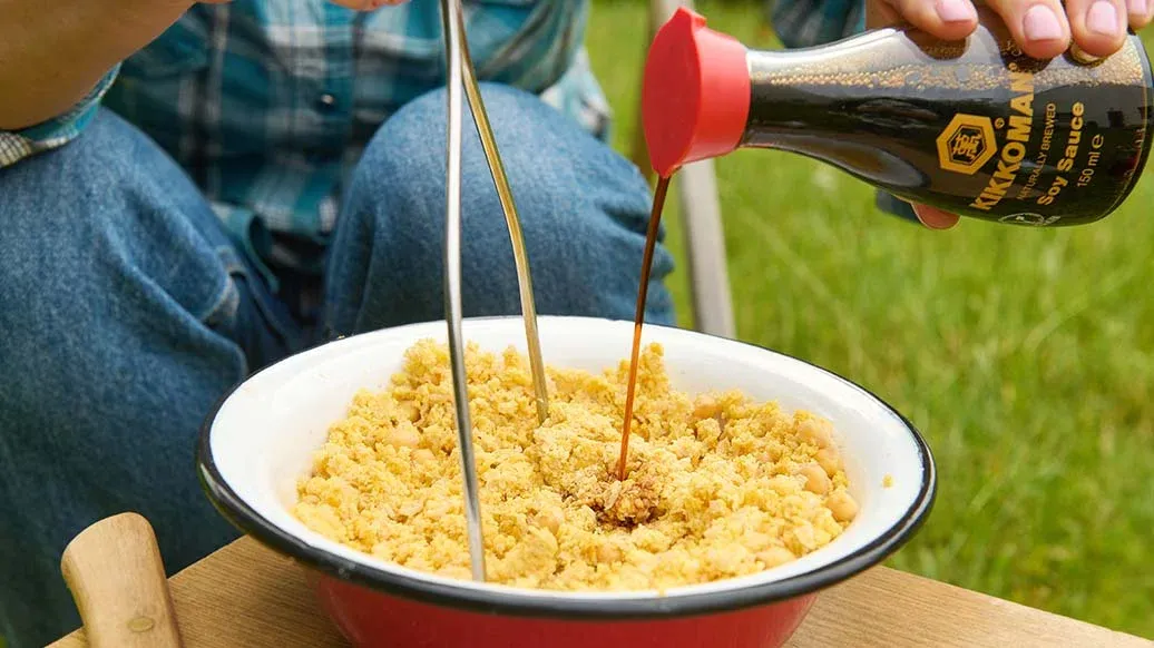 Pique a cebola. Coloque-a no liquidificador juntamente com o grão-de-bico (em alternativa, pode triturar a mistura com uma picadora ou esmagá-la com um esmagador de batatas). Quando a mistura estiver triturada, adicione as especiarias, o molho de soja Kikkoman, o bicarbonato de sódio e as ervas aromáticas e misture tudo. Molde a mistura em hambúrgueres.