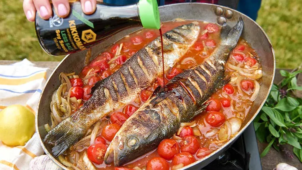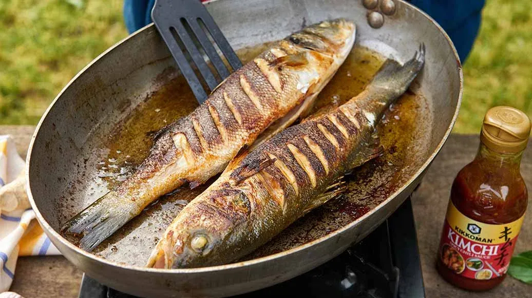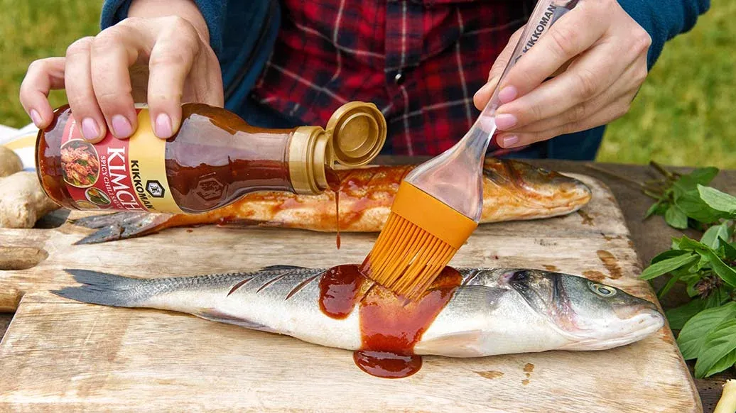 2 robalos, cada com aproximadamente 350 g – 3 colheres de sopa Kikkoman Molho de Chili Condimentado Kimchi
